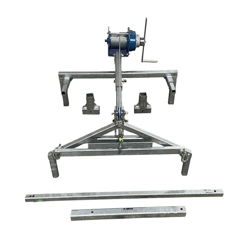 The winch consists of winch roller bar, winch frame, winch, support arm, winch picking bar, five 5/8″ bolts and 2 frame support brackets with caps.