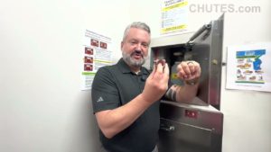 You also want to make sure you remove the dumpster from the compactor and make sure that that space in the compactor is free of debris or trash because the DNS soapy disinfecting solution is going to come straight down your chute into the hopper of your compactor and then out onto the floor. That’s how it’s designed to do and that’s fine because the hopper gets hit with trash as well. So, as it comes out to the floor, then you start to move it into your drain. Uh, you will have a you’ll have a drain somewhere in your room, and that’s where it’s located, and that’s where the solution goes. Once you’re done running the system, don’t forget to either turn your key or plug your doors back in, and then replace the dumpster on the compactor. You’re good to go.